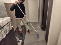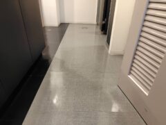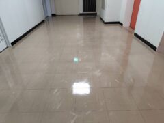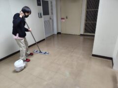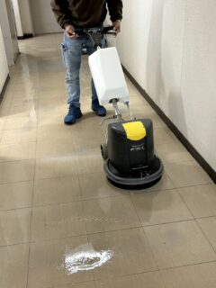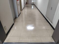 各階の共用部分の廊下やトイレの床を清掃し、ワックスを塗布しました。